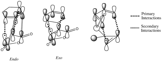 The stabilisation between the C-H σ* orbital on the diene and orbitals of the side groups of the alkene has been described in literature[5]. This description of the interaction could be applied to the Diels-Alder reaction studied in this section. Imade and co-workers described the orbital interaction of the orbitals of the diene not directly involved in the bond formation with the sidearms belonging to the alkene. In the particular study, the alkene of interest was cyclopropene. This secondary orbital interaction was only found in the endo transition state, but not the exo transition state. The other interaction as mentioned in the previous paragraph was described also in literature by Salvatella and co-workers[6]. The diagram below describes the extra orbital stabilisation found in the endo conformer, and the third diagram from the left depicts the description reported by Imade and co-workers[5].