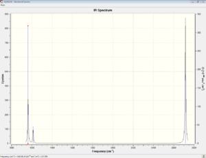 As you can see from the table and the spectra above, there are fewer vibrational peaks on the IR spectrum than there are actual vibrations in the molecule. This is because in order for a vibration to be IR active, there must a change in dipole moment in the molecular vibrations. The lower intensity peaks are only slightly IR active because there isn't a a large change in dipole.