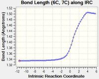 D | As the reaction progresses, the length of Bond D increases. This is because Bond B is initially an C=C single bond in ethylene, which becomes a sp3-sp3 C-C single bond in cyclohexene. These lengths are similar to typical values of 1.34 Å for alkenes and 1.54 Å for sp3-sp3 C-C bonds.[1] | |