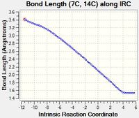 As illustrated above, the formation of the two bonds are synchronous as the relevant pairs of atoms (C1/C11 and C7/C14) are moving towards each other at the same time, with the distance between the two atoms being approximately equal in both pairs. This is to be expected as evidence shows that the Diels-Alder reaction can proceed via a concerted, synchronous mechanism.[3] However, it is important to note that this may also be the result of the calculation method used, as studies with other calculation methods (DFT/B3LYP) have also shown that other mechanisms are feasible.[4]