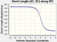 A | As the reaction progresses, the length of Bond A increases. This is because Bond A is initially a C=C double bond in butadiene, which becomes a sp2-sp3 C-C single bond in cyclohexene. These lengths are similar to typical values of 1.34 Å for alkenes and 1.50 Å sp2-sp3 C-C bonds.[1] | |