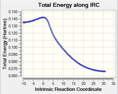 The frequency calculation showed that the PM6 optimized transition state has one imaginary frequency at -949.cm-1. An IRC analysis was done for confirmation. IRC followed a minimum energy pathway on the PES from the transition state to either the product or the reactant. In this experiment, an IRC path starting from the transition state to reactant was simulated. TS was successfully located and optimized because the energy gradients were at zero at the reactants , product and the TS.