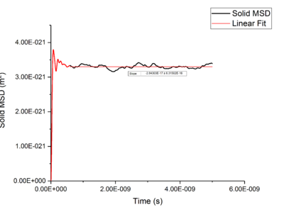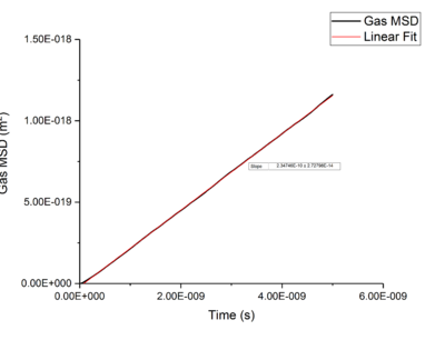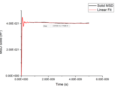 Plotting MSD against time, gives a graph with a gradient of and therefore a diffusion coefficient equal to . These plots can be seen in figures 4-9 for solid, liquid and gas phases, along with plots of data given to us of those phases with one million atoms. If data points were not used in the linear fit of a graph as they did not follow the linearity expected for the gradient were masked and are shown in red on the plot.