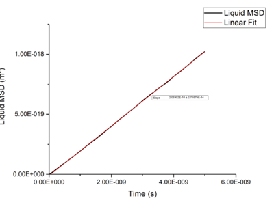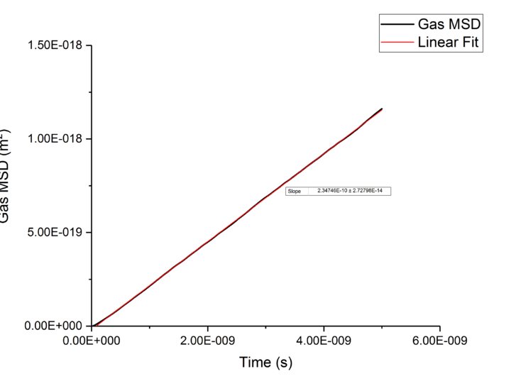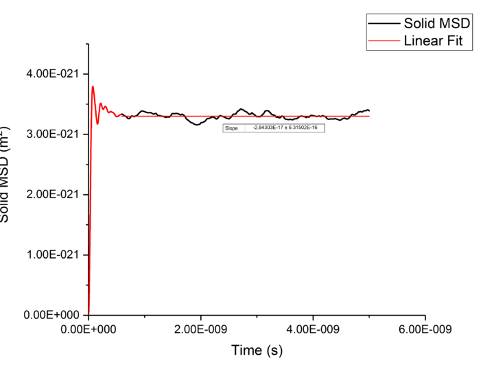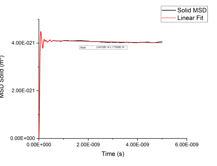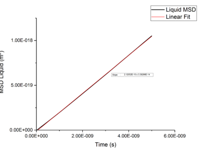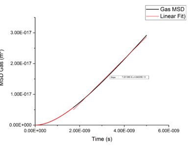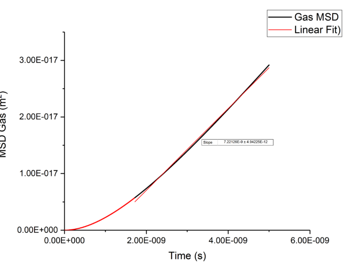 Using the equation and the relationship between D and Mean-Squared Displacement , was calculated for solid, liquid, and vapour phases by extracting the gradient from the plot of Mean-Squared Displacement against time, giving a gradient of .