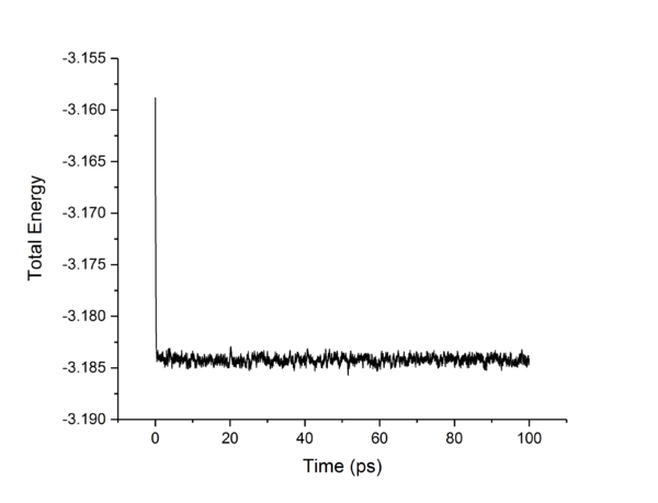 The total energy of a classical harmonic system is given by and for the kinetic and potential energies respectively. Combing these give the total energy of the system which should be a constant for an isolated system as no energy enters or leaves the system. A time-step value of 0.2 s gives a maximum difference in energy of 1% of the total starting energy, and so ensures a good approximation to realistic behavior. The Velocity-Verlet algorithm will have fluctuations in the total energy of the system as it is only an approximation through a Taylor-series expansion, however, minimizing these fluctuations provides a more accurate simulation and therefore for a physical system would provide more accurate thermodynamic properties of the system. Decreasing the time-step, and so decreasing the energy fluctuations will provide more accurate results at the cost of increased simulation time needed for the same time frame of a system, and so is a trade-off between time and accuracy for the simulation.tick