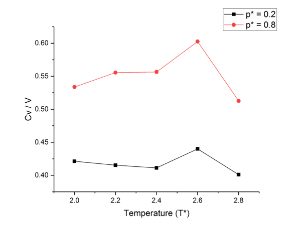 Heat Capacity simulations were run at = 0.2 and 0.8, and = 2.0, 2.2, 2.4, 2.6, 2.8 in L-J reduced units. A simple cubic crystal was melted under microcanonical NVE conditions. As heat capacity, shown below, is directly proportional to the variance of energy of the system if temperature is held constant, after melting, the system was put under an NVT ensemble to hold the temperature constant but allow the energy to vary.
