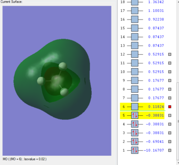 This anti-bonding orbital related to the anti bonding of the hybridised Carbon sp3 and the 1s on each Hydrogen. Higher in energy than the LUMO. Its energy is 0.17677 au and has of course, 2 other MO's that are degenerate to it- MO 8 and 9.