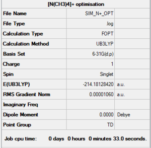 Item Value Threshold Converged? Maximum Force 0.000203 0.000450 YES RMS Force 0.000098 0.000300 YES Maximum Displacement 0.000737 0.001800 YES RMS Displacement 0.000395 0.001200 YES Predicted change in Energy=-1.355408D-07 Optimization completed.