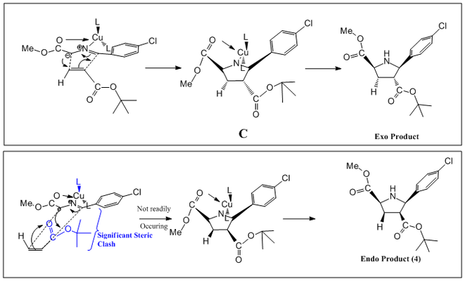 Phosphino-Oxazoline ligands were used for coordination to the Cu(I) centred complex, these in combination with Cu(OAc) were readily able to catalyse the [3+2] cycloaddition. They were also determined to bring about strong exo-selectivity over the endo product. This was because the large bulky ligands added on to the steric bulk around the metal complex (Diagram C). This made the steric repulsion between the ligands and the dipolarophiles to become more significant and thus the endo approach was highly not favoured. The exo approach minimised the steric repulsion making it much more favourable.