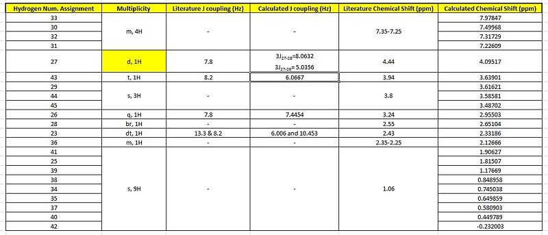 Although, it was stated that the 1H NMR were less reliable, the 3JH-H coupling constants were compared with the literature attained coupling constants. This was done by the utility of the Jancchio software to provide the computationally calculated coupling constants. The results were summarised in table B along with the calculated chemical shifts 'tagged' onto the proton expected of that chemical shift.