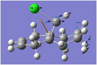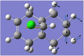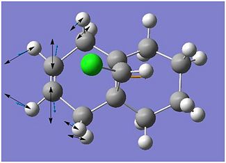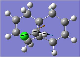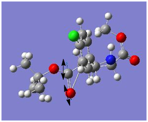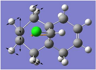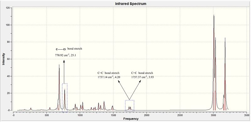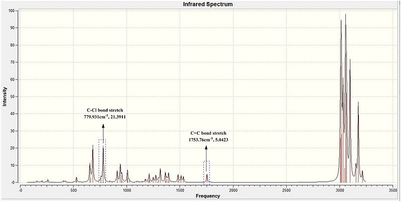 Similarly, C=C bond stretches has a literature value of 1670-1870 cm-1. Both values in table 14 are within the range. However, the Exo has a smaller stretching frequency magnitude as compared to the endo C=C bond. This can be re-considered with the conclusion made in the earlier MO section. The C-Cl bond is anti-periplaner to the exo C=C pi orbitals allowing an effective overlap of the C-Cl sigma* antibonding orbitals with the C=C exo pi bonding orbitals. Thus, there will be a significant amount of electron density from the C=C bond directed towards the sigma* bond. But C=C endo is not antiperiplanar to the C-Cl orbital and will not have this secondary orbital interactions. Thus, the electron density of the C=C endo is larger than the C=C exo allowing the endo to have a greater vibrational frequency and thus a slightly higher magnitude by +20 cm-1.