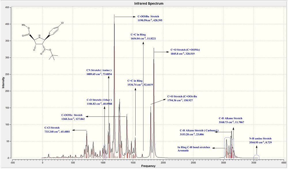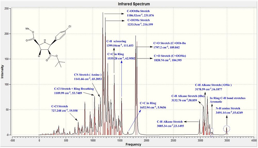 When both the Ir spectras, corresponding table and graphs were compared, it is seen that the IR stretching frequencies for both the molecules are almost identical. Both the calculated IR spectra encompassed the key vibrations that were expected from the molecule such as the N-H, and the 2 distinct carbonyl stretches. The stretching frequency of the methoxy carbonyl C=O stretch is slightly higher than the stretching frequency of the O-tBu C=O stretching in both the compounds which is indicative that there is a slightly stronger C=O bond in the methoxy carbonyl as compared to the O-tBu. But as both are very similar with minimal deviations from the literature range, the computational geometry of the two products can be said to be rather accurate to that of the molecule in reality.