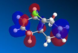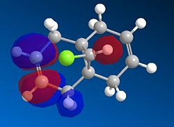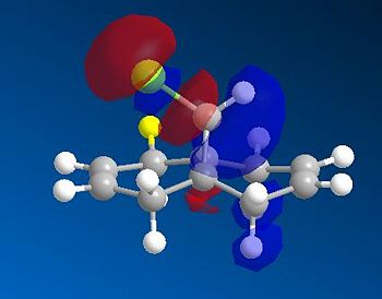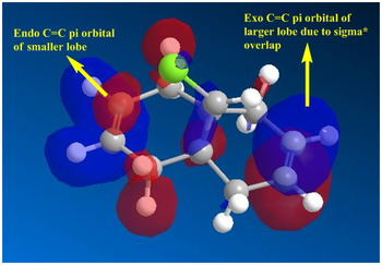 Analysis of the HOMO-1 shows that the exo orbitals are more readily stabilised as compared to the endo orbitals. This is attributed to the Cl-C sigma* orbital having an antiperiplanar interaction with the exo pi-orbital. This explains the larger lobe of the Endo alkene; indicative of higher electron density. The Cl-C sigma * orbitals are readily seen as the LUMO +1 orbitals (Diagram 13).