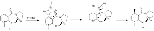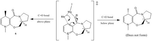 The optically active prolinol derivative (5) reacts with the grignard reagent methyl magnesium iodide to alkylate the pyridine ring at the para position. According to literature, this reaction results in the absolute stereochemistry(6). The regioselectivitiy and stereoselectivity of the nucleophilic attack is rationalised to be due to chelation. The incoming grignard reagent has the electropositive Magnesium mental centre readily coordinating to the electronegative oxygen of the carbonyl.[15] It is the chelative effect that influences the face via which the methyl group attacks the pyridine ring. This addition of the methyl group occurs via a nucleophilic addition reaction (Diagram 7). Thus, the relative stereochemistry of the carbonyl group has to be taken into account towards determining the direction from which the nucleophile attacks.