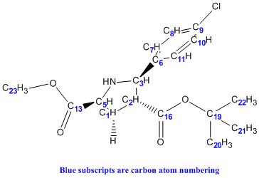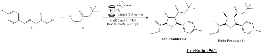This reaction has been chosen as it involves the formation of highly substituted 5-membered heterocycles via a very common 1,3-Dipolar cycloaddition method. The 5 membered rings being highly substituted, are very useful towards the synthesis of biologically active molecules and functioning as organic catalysts.[29] [30] Thus, it is of paramount importance that the correct isomer is isolated for its further use in the synthesis of catalysts and biological molecules. In most cycloaddition reactions that involves the combination of N-methalated azomethine yildes and electron deficient alkenes, the endo adduct was either the major product or it was the absolute product formed. In this paper however, the Cu-(I)/P,N-ligand catalyzed [3 + 2] cycloaddition of N-metalated azomethine ylides with acrylates was able to yield the exo adduct as the major product with high enantioselectivity. Furthermore, the studies carried out were the first to have use the Cu(I) salt as a catalyst towards 1,3-Dipolar cycloaddition of azomethine ylides.[31]