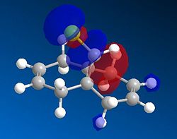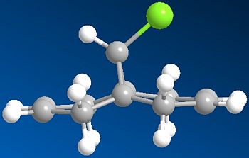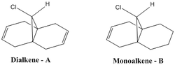 9-Chloro-1,4,5,8-tetrahydro-4a,8a-methanonaphthalene undergoes a regioselective addition with dichlorocarbene (diagram 10). The starting reagent is an asymmetric molecule with the presence of two alkene bonds. This induces the potential for regioselectivity for one C=C bond over the other. The calculations carried out facilitate the rationalisations for why one C=C bond is electrophilically more favoured over the other. Based on the mechanism, electrophilic addition could either be added endo or exo to the plane. However, experimentally only the endo isomer was isolated bringing about absolute regioselectivity to the reaction.[26]