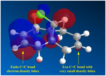 - The above rationalisations show that endo C=C is more electrophilic and accessible to an approaching electrophile. The endo product is more readily formed as compared to the exo product. However, when this is compared with the literature molecular orbitals, deviations are seen from the above orbitals generated.