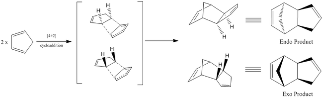 Cyclopentadiene readily undergoes [4+2] cyclo-addition (diels-alder) reaction to form two stereoisomers (exo dimer or the endo dimer).Diagram 1 shows the mechanism of the expected [4+2] cycloaddition and the two dimers that could result.
