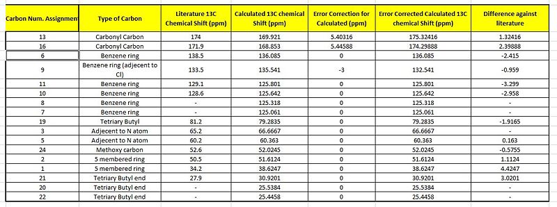 As the carbons are all accounted for individually via both the literature and computationally, unlike in the H NMR analysis, here the total number of data points correspond to each other. However, as the position of the different carbons influences the extent of deshielding and this is to be taken into account a number of error corrections are carried out. These error corrections as labelled in the table above show a much greater similarity to the literature values which makes the 13C NMR much more accurate as compared to the H nmr. This is well observed by the plot of the graph where there is a large degree of overlap between the two plots. This is indicative of very minimal deviations for the calculated from the literature chemical shifts. This is quantitatively seen where all the differences are less than 3 ppm.