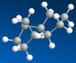 Comparing the overall energy of both molecules, molecule 1 is lower in energy (31.17 Kcal/mol) than molecule 2(35.70 Kcal/mol) by 4.53 Kcal/mol. Thus, the hydrogenation of the cyclohexene alkene bond gives rise to the more stable product as compared to hydrogenation of the cyclopentene alkene bond. This makes molecule 1 to be more thermodynamically favoured over molecule 2. The total energy of the endo-dimer was 34.002 Kcal/mol but the hydrogenated product is of a lower energy. When this is compared with the energy levels of both hydrogenated products it is noticed that the formation of molecule 1 is an exothermic reaction. This results in the lower energied, thermodynamically more favoured product to be formed. The formation of molecule 2 is an endothermic reaction where hydrogenation results in an increase of the total energy making it thermodynamically less favoured.