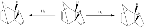 From Section 3.2 it has been conclusively rationalised that the dimerisation of cyclopentadiene occurs under kinetic control to give the endo-product exclusively. Thus, hydrogenation with one equivalence of H2 gas will be considered only for the endo product. As the endo product has two unsaturated C=C bonds, hydrogenation is initially expected to be able to occur at either bonds as represented in the reaction scheme (Diagram 5). Based on experimental evidence, hydrogenation is regioselective and dependant if the reaction is thermodynamically or kinetically driven.