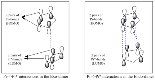 The endo-dimer is the kinetic product under kinetic control as it has a more stable, lower energy transition state. Thus, stereo-electronically, the endo-dimer transition state has a greater amount of HOMO-LUMO interactions as compared to the exo-dimer. This enables a greater extent of stabilisation for the endo forming transition state. The selectivity for the higher energied-endo dimer can also be explained by the Woodward-Hoffman rules [11] [12] or the frontier orbital theory (diagram below).