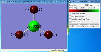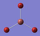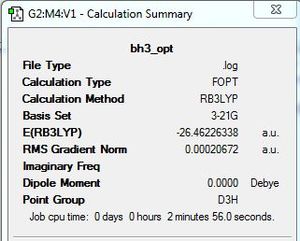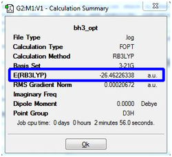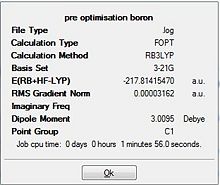 The data in table 2 was extracted from the output log file where the intial bond distance of 1.50 Å was reduced to 1.1944 Å upon optimisation. The optimised H-B-H bond angle was calculated to be 120.0 degrees. When this was compared with literature data (1.18 Å,120 deg) they were in exact agreement with the calculated values.[1] The bond angle can be rationalised being due to the sp2 hybridised centre that subtends the hydrogen atoms at 120 degrees.