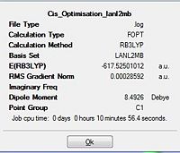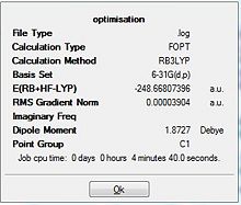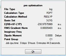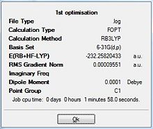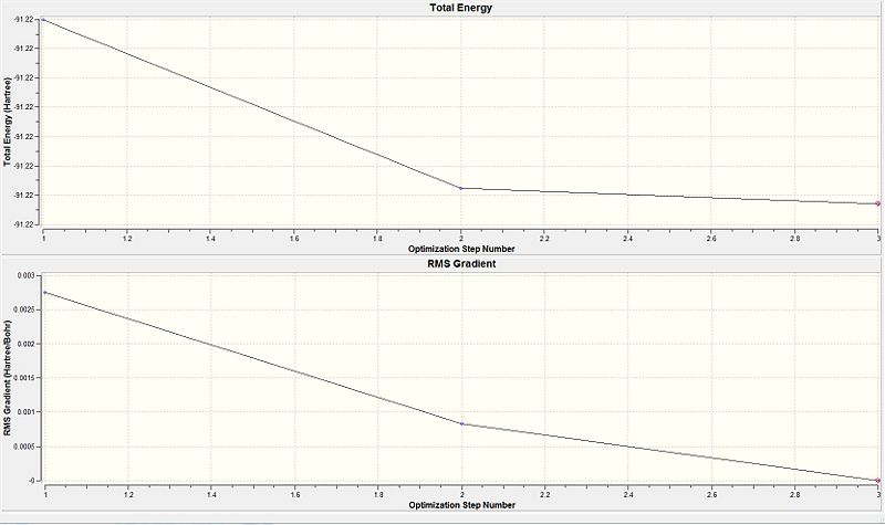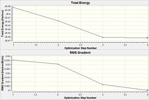 For the calculation summary (diagram 1), results are given in atomic units (a.u.) where the unit conversion is 1 a.u. = 2625 KJ/mol. When the RMS gradient is smaller than 0.001 a.u., the change in potential energy compared against the change in bond length results in an almost horizontal plot. This is indicative that the molecule has been fully optimised.