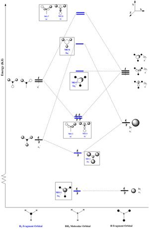 For the formation of the molecular orbitals via the LCAO approach, it was carried out via the linear combination of two fragment orbitals (FO. The two FOs make up 8 atomic orbitals (AO) (Black Lines). As the number of AOs = number of MOs, 8 molecular orbitals are expected from the linear combinations. The extent of splitting in the formation of the molecular orbitals is approximated to the degree of overlap and the difference in energy levels. The smaller the difference in energy levels of the AOs and the greater the degree of overlap, the larger the bonding-antibonding orbitals splitting. The borane molecule has a point group of D3h. Thus, with the aid of the character table, the MO diagram is constructed where each MO is given the symmetry label (in blue).