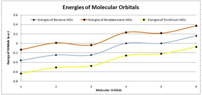 As seen from the above tables and diagrams, it can be seen that for all there analogues the expected orbital phases are highly similar to the calculated molecular orbitals. However there is a difference in the HOMO-LUMO gap for a three analogues and is due to the difference of the R atom substituted into the ring. The benzene has a difference between MO 3 and MO 4 of 0.248 a.u. while the Boron analogue has a difference between MO 2 and MO 5 of 0.224 a.u. which is a slightly smaller gap and finally the nitrogen analogue has the gap between MO 3 and MO 4 of 0.220 a.u. It would show that the nitrogen analogue as expected is the better pi acceptor due to the electronegative nature of nitrogen.
