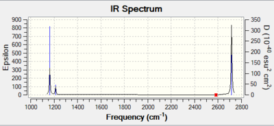 In the spectrum there are less than 6 peaks. This is because there are two sets of vibrations with degenerate energies, these sets occur at frequencies 1213 and 2715. As a result, 4 vibrations are represented by two peaks. There is also a stretch at 2583, however since it is a symmetric stretch, it is not IR active and as a result does not appear on the spectrum. Therefore, only 3 peaks should be seen in the spectrum.