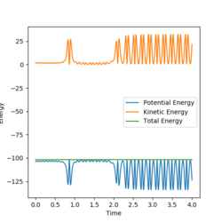 The energy vs time graph shows a mirror image between the potential energy and the kinetic energy. This therefore means as the potential energy increases, the kinetic energy decreases and vice versa. This shows the conservation of energy. Overall, the potential energy decreases during the reaction and the kinetic energy increases. The increase in kinetic energy correlates with the reaction being exothermic and it being released as heat energy. With heat energy being released, a calorimetry experiment could be done as this experiment can effectively measure the change in temperature during the course of a reaction.