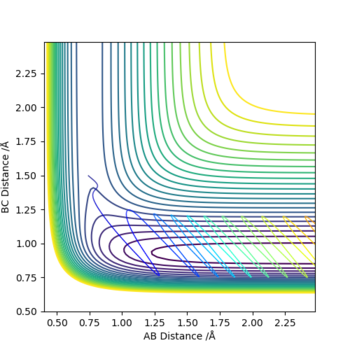The best estimate for rts was found to be 0.908. The plot to the left below shows inter-nuclear distance against time and when atom A and C are at this distance from atom B there is little oscillation which can only be seen by zooming into the graph (also shown below). This shows that the trajectory will oscillate on the ridge and never fall off. The image to the right shows a contour plot of this reinforcing the idea that 0.908 is a good estimation as the atoms are in the same position and stay on the ridge.