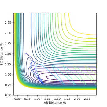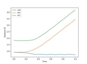 -1.25 | -2.5 | -99.119 | yes | Graph 1 shows the reaction occurs as the A-B bond length increases then the bond breaks. B-C forms after |