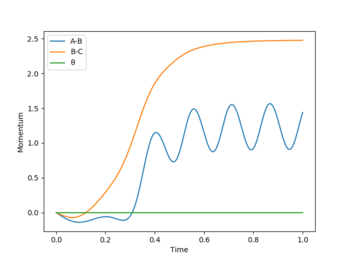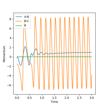 Reversing the initial conditions would result in a flip on the "Internuclear Distances vs Time” and “Momenta vs Time” graphs (as shown below). When time is large we see the distance between B-C increases from 1 to 10 armstrongs and the A-B bond length remains constant as the atoms don't move (approximately 0.75 Å). As time increases momentum also increases overall. As t increases momentum of A-B increases as we are moving from vibrational to translational energy and B-C momentum oscillates as as the reaction occurs its translational energy is turned into vibrational energy.