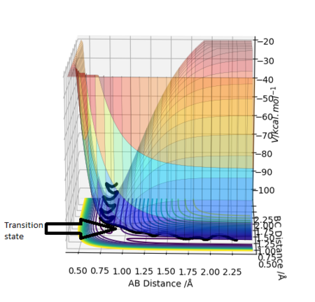 The transition state is defined as the maximum on the minimum energy path linking reactants and the products. It can also be viewed as a saddle point using mathematical terms as it is a maximum in one direction and a minimum in the other. Also at a saddle point on a surface all the first derivatives are zero and the sum of the second derivatives comes to zero. Shown below is the surface plot of the reaction between molecule A-B and C. The arrow shows shows the Transition state which corresponds to a saddle point.