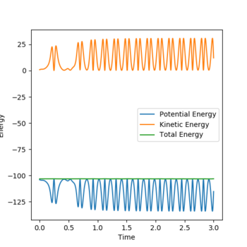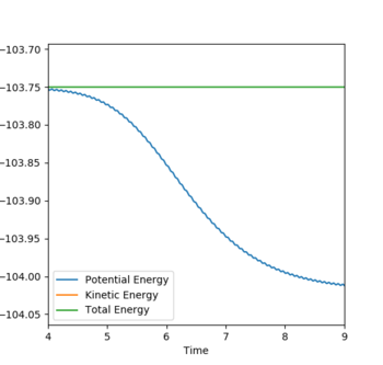 The first graph shows momentum over time and during the reaction we see the momentum of A-B over time level off and this is because B moves further away from A and there is no vibrations between the two.The second graph shows that energy is conserved as potential energy is mirrored by kinetic energy. This means that potential energy is being converted into kinetic energy and kinetic energy is being converted into potential energy. The green line on the graph shows total energy and because it remains constant this proves energy is conserved. The high oscillations could be a result of the H-F bond formation being very high energy. As stated before one reaction is endothermic and the other is exothermic and because heat will be released or taken in depending on the reaction calorimetry could be used to determine this experimentally.