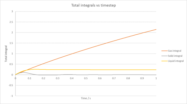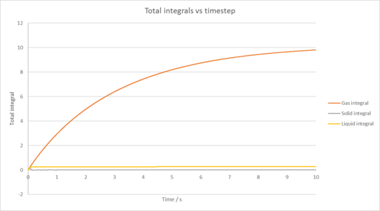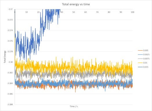 The 0.001 time step reaches equilibrium very quickly in around 2 seconds. Compared to the other 4 timesteps, the 0.0025 time step also reaches equilibrium in around the same time however the same cannot be said for the others. The worst choice of time step would be the 0.015 time step in this case, as instead of tending towards an equilibrium amount of energy it is instead increasing in energy. This indicates our calculations may be inaccurate compared to how the experiment would behave in real life. tick