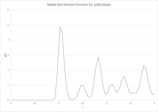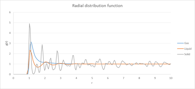 The Radial distribution function differs between the solid, liquid and gas phases of our substance in a few main ways. Compared to the liquid and gas phases, the solid RDF contains significantly more maxima and it also decays to one much more slowly compared to the other two phases. This occurs because in the solid phase, our atoms have a regular/periodic structure where our atoms are held roughly in the same place (but can undergo some vibrational movement). As a result we see a number of peaks in our RDF plot which represent the different coordination shells that surround our reference particle. Our function also decays to one (corresponding to the bulk density of our substance) much more slowly than the other phases due to the long range lattice structure the atoms in our solid have.