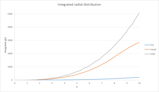Plots of the radial distribution function and its associated integral as a function of radius for the solid, liquid and gas phases. |