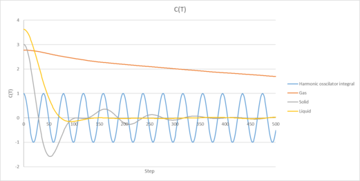 Figure 6: Plot of our VACF and its running integrals for each phase of our simulation against time. The 1D harmonic oscillator has also has its VACF plotted for comparison. |