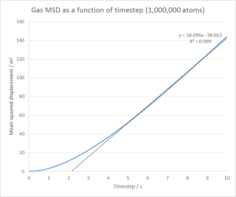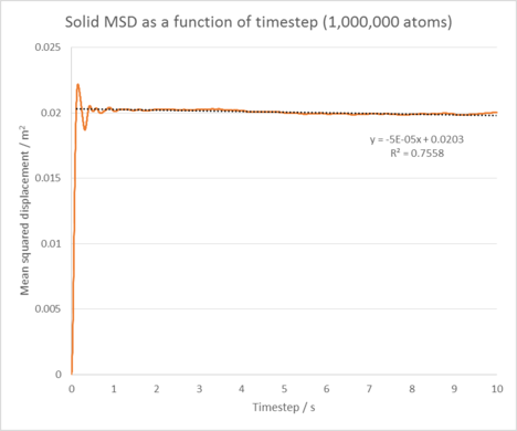 The diffusion coefficients were then calculated by using the equation: . Table 1 shows the results of our simulation in comparison to a 1,000,000 atom system. These results suggest our simulation has been successful in modelling a simple liquid as our diffusion coefficients increase as we go from the solid to gas phase. Our values also compare well to that of the larger system. tick