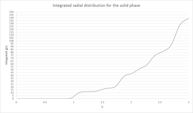 Figure 3 shows the Radial gram distribution function and its associated integral for the solid, liquid and gas phases of our substance. Compared to the liquid and gas phases, the solid RDF contains significantly more maxima and it decays to one much more slowly compared to the other two phases. This occurs because in the solid phase, our atoms have a regular/periodic structure where our atoms are held roughly in the same place (but can undergo some vibrational movement). As a result we see a number of peaks in our RDF which represent the different coordination shells that surround our reference particle. Our function also decays to one (corresponding to the bulk density of our substance) much more slowly than the other phases due to the long range lattice structure the atoms in our solid have. tick