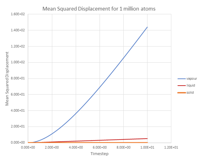 Figure 20 shows a plot of the total mean squared displacement against timestep for the three different phases: a vapour phase, a liquid phase and a solid phase.