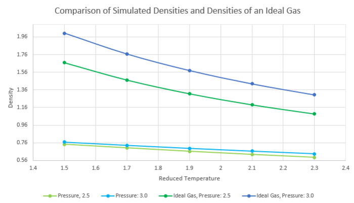 Figure 14 is a plot of density against reduced pressure. As temperature increases, density of the system decreases which in turn suggested that the volume increased when the system increased in energy.