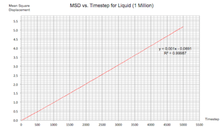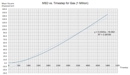 The first two plots show the variation of the MSD with timestep when looking at a gaseous system. It can be seen that initially, the graph follows a parabolic relationship due to the fact that at the beginning of a simulation the gas atoms are placed at random, far from one-another. As a result there are fewer collisions between the atoms and interactions are small, overall resulting in each atom travelling at a constant velocity. At a constant velocity, the distance travelled per unit time is constant, so from the MSD equation above it follows that . At a larger timestep, however, collisions become more frequent and the graph becomes linear to represent the Brownian motion of the gas particles. The second plot looks at the linear section in isolation, beginning on the 2000th timestep. This gave a more accurate value for the gradient and the value of increased from 0.98071 to 0.99833.