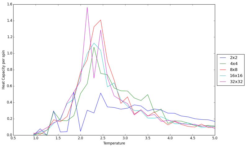 The output plot shows that the maximum asymptote for energy per spin increases for larger system sizes. The Curie temperatures, where magnetisation dramatically decreases, become progressively higher for larger system sizes. We can see that the 2x2 system is especially poor with the phase transition occurring over a range of almost 1.0 K. The decrease in magnetisation is also sharper for a large system size and I would expect a real-world plot to illustrate a sharp phase transition like in the larger system sizes. The error bars show a considerable amount of variance of energy and magnetisation at the phase transition region.