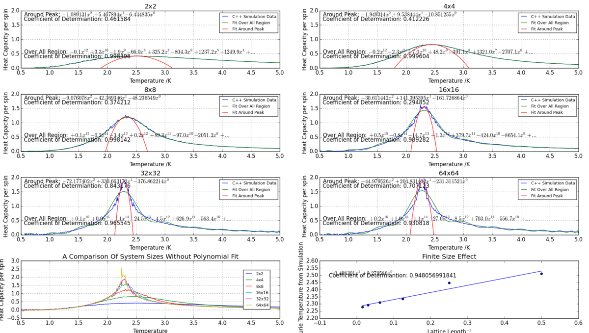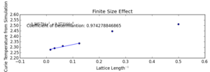 These data allowed me to plot Curie temperature v. 1/L to explore the linear relationship . The plot with its linear fit can be seen on the bottom right of the multi-plot. The fit suggests that the Curie temperature, in an infinite lattice (errors calculated from the coefficient of determination). The theoretical calculation for such a lattice is 2.269185[1], within the lower bounds of my result.