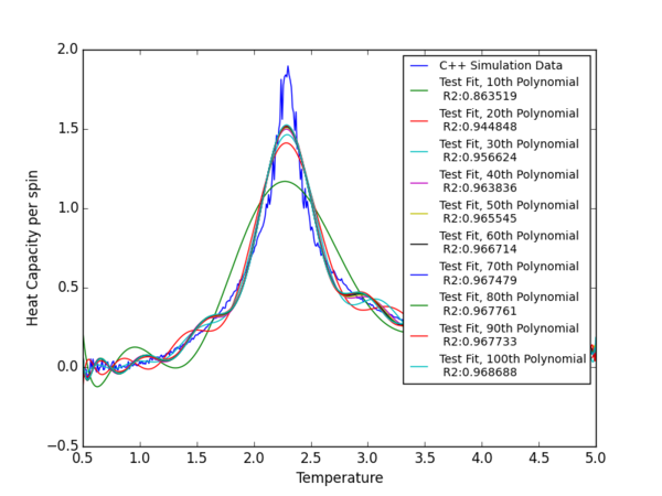 I am not surprised with the poor fits even with very high powers of polynomials. The heat capacity function is almost discontinuous and theoretically approaches infinity at the transition temperature. I think that R2 = 0.96 does represent an accurate fit with this imperfect polynomial model and gives a good estimate of the peak. Hence I applied the 50th order polyfit to all system sizes. I used a numpy function to find a positive root for the derivative of the polynomial fit. I also calculated the coefficient of determination for the fit.