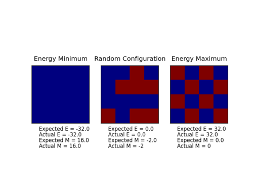 I completed the IsingLattice.energy() and .Magnetisation() functions, and the code can be found here with comments. The energy calculated uses the reduced term in units of <math>k_B</math>, which is the assumed unit from now on. The ILcheck.py script confirmed that these functions returned the correct values. JC: Check the formatting of your final document, e.g. problem with maths formatting here.